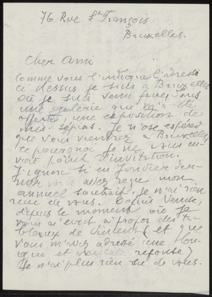 This undated letter was written by Emile Bernard. The stark contrast between the blue ink and the pale background immediately draws the eye, creating a strong visual field reminiscent of early modernist sketches. Bernard fills the surface with dense, almost rhythmic lines, not just conveying a message but crafting a visual texture. The handwritten text becomes a field of signs and forms; each stroke of the pen a conscious mark that contributes to the overall composition. This can be seen as a move towards the symbolist style as well. The act of writing, therefore, isn’t just communication. It is a physical and intellectual engagement with the material, a way to explore form through language. Consider how Bernard disrupts conventional communication by emphasizing the physical act of writing. This piece challenges our understanding of text, suggesting that it can be viewed as a field of artistic expression. It invites us to reconsider the boundaries between writing, drawing, and visual art.