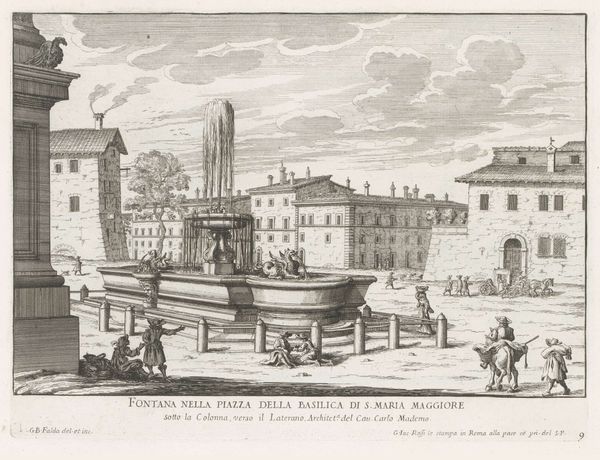 Editor: This is Giovanni Battista Falda's "Fontana del Pantheon op Piazza della Rotonda te Rome," an engraving dating from sometime between 1653 and 1691. I find the contrast between the grandeur of the fountain and the everyday life around it quite compelling. How do you interpret this work? Curator: Falda’s engraving offers us a glimpse into 17th-century Rome, but it's more than just a pretty cityscape. It presents a carefully constructed image of power and social dynamics. Consider the placement of the fountain itself – a symbol of papal authority and urban control, designed to impress and provide a public service. But who benefited most from this public space? Editor: Well, everyone in the scene seems to be using the piazza in their own way... Curator: Precisely! And that's where it gets interesting. Notice how Falda depicts different social classes interacting, or perhaps just co-existing, within this carefully designed space. The engraving allows us to think about how urban spaces are never neutral. They are always political stages, reflecting and reinforcing existing power structures and social inequalities. The placement, scale, and function all reflect those in control. How do you think this image contributed to the creation, or perhaps the maintenance, of a particular Roman identity? Editor: That's a fascinating point. Maybe the image serves as propaganda, promoting Rome as a beautiful, functional, and harmonious city, despite the likely social tensions beneath the surface. Curator: Exactly. These images played a vital role in shaping perceptions and reinforcing narratives of civic pride. It’s about constructing an idealized version of urban life. The reality, as always, was likely far more complex and contested. Editor: I see it differently now. It is not just a pretty fountain. There is a power structure to appreciate and to question. Curator: And that's the crucial element. Engage with art as a social document, and you'll always find something new to question!
