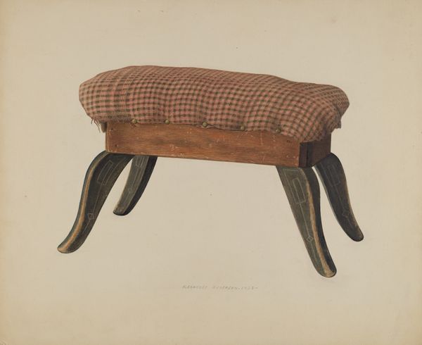 Frank Wenger made this drawing of a stool, we don’t know when, using graphite and watercolour. What strikes me about the picture is how deliberate it is, each line carefully placed, like a meditation. You can almost feel the texture of the stool, the plushness of the dark seat contrasting with the smooth, polished wood of the frame. Wenger uses watercolor in thin washes, allowing the paper to breathe through. The color is restrained, almost monochromatic, with subtle gradations that give depth and form. Look at the curved legs of the stool. See how the artist has captured the light as it reflects off the surface? It's details like these that bring the object to life. It reminds me of those meticulous drawings by Agnes Martin, where every mark is a testament to the artist's focus. Both artists share a similar approach, which embraces simplicity and precision as a way of seeing the world. It's a reminder that art isn't always about grand gestures. Sometimes, it's about finding beauty in the everyday.