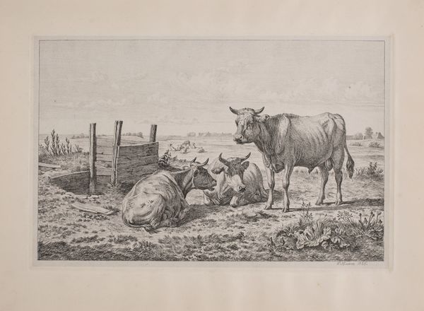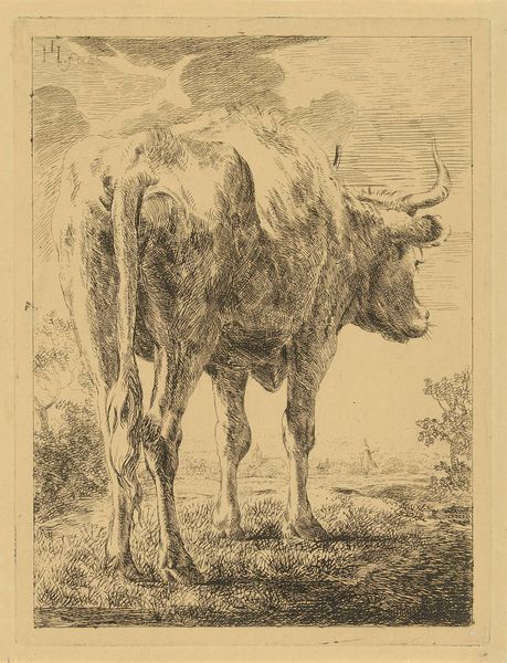 Editor: Here we have A.P. Madsen's "En stående ko," or "A Standing Cow," an 1849 engraving. It's simple and quite charming, actually. The cow seems very… present. What do you see in this piece? Curator: I see more than just a cow. This engraving offers us a glimpse into the 19th-century relationship between humans and animals, specifically within a socio-economic context. Consider how depictions of livestock often served to validate land ownership and agricultural prosperity. How might Madsen’s detailed rendering of this cow, almost life-sized, comment on that dynamic? Editor: So it's less about the cow itself, and more about what it *represents* in society? Curator: Precisely. The rise of Realism in art coincides with significant social upheavals. Artists began turning their attention to everyday life, including rural existence, partly as a response to industrialization. Think about how this cow, standing in its field, connects to broader dialogues about land use, labor, and the changing rural landscape. Where do you think Madsen places the animal within this framework? Is it romanticized or presented as a working animal? Editor: I see what you mean. It's not idealized – it looks like an ordinary farm animal. Perhaps Madsen is grounding us in the reality of agricultural life, highlighting the essential role of animals within that economy. Curator: Exactly. By depicting the cow so realistically, without sentimentalizing its image, Madsen acknowledges the labor and economic functions these animals performed. Understanding art history is crucial in examining this relationship because the art helps us unpack our complicated and evolving relationship with animals. I hope people viewing art take away that this is always a relevant subject. Editor: That’s really changed how I see this simple image. I wouldn’t have considered all of the social commentary tied into it!