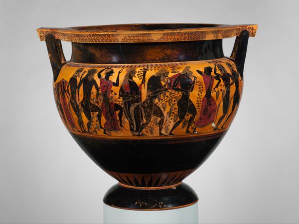 Curator: Here we have a "Serving Dish from a Royal Berlin China Service," likely dating from around the turn of the 20th century, housed right here at the Minneapolis Institute of Art. The medium is porcelain, which is a fine type of ceramic, so very delicate and often considered quite precious. Editor: The scene illustrated on the dish has an immediately striking, vibrant quality. The red and black figures against that lighter ground create a strong, eye-catching image; it's incredibly graphic. The shape, a wide oval, invites closer inspection too. Curator: Precisely. Its aesthetic is indebted to classical antiquity, particularly the ancient Greek pottery tradition. There are figures evocative of the Trojan War or perhaps a triumphant Roman general, although that’s not exactly known.. We might interpret the narrative it tells as symbolic of power dynamics. Note the hieroglyphic-looking images to the left; they represent a dog, and there are floral shapes throughout the outer space between figures. Editor: And look at the production. This isn't your everyday dish; the meticulous detailing and precise lines speak to the high level of skill that would’ve been involved in its creation. Think about the various firings, the mixing of the pigments, the labor involved. This dish wasn't made to just hold food; it's communicating status. Curator: I would certainly say so! We need to remember, this object emerged during a period of intense nationalism. These dishes were tools in maintaining and performing particular identities of cultural authority and, as such, can be read in dialogue with period texts concerning empire. Editor: You're right to call it a tool, though I want to reframe the material processes it underwent in its production. The serving dish also underscores global material flows that fed Europe’s craze for exotic aesthetics and styles from a broad historical lens. The act of service and dining, enabled by this object, would reinforce existing hierarchies and class structures. Curator: Thinking about material culture allows us to unpick and better grasp the many levels upon which gender, empire and the exotic operated within turn of the century German society. This one, somewhat fragile, serving dish helps us understand the larger context. Editor: Exactly. Appreciating the labor involved, the processes of creating and consumption... it brings new meanings to what at first may simply seem like a decorative object. We learn more about ourselves through its history.