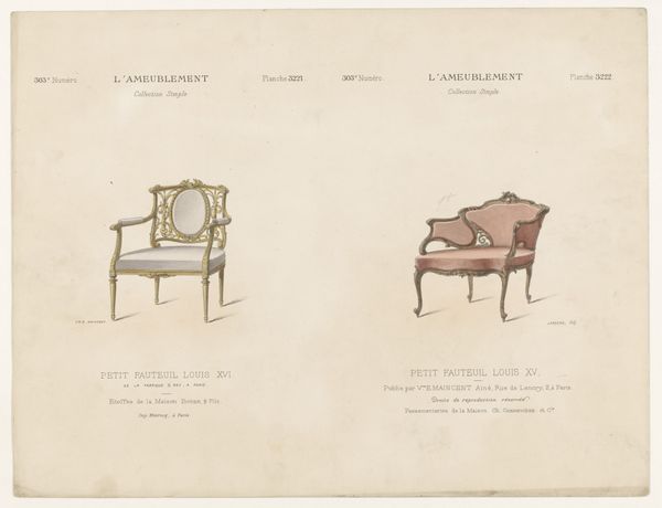 Editor: This is “Canapé,” a drawing and print by Léon Laroche, made sometime between 1895 and 1935. It seems like a design for an elegant piece of furniture. It is quite detailed in its depiction of the sofa; what design elements stand out to you? Curator: The canapé presents itself as a study in decorative formalism. Notice how the artist orchestrates a dialogue between line and surface. The gilded frame, defined by its sinuous contours, plays against the rectilinear structure of the striped upholstery. This tension generates visual interest. The floral patterns soften the rigor of the vertical stripes. Editor: So it’s about the contrast between those elements. Is there any kind of deeper meaning? Curator: Meaning resides primarily within the interplay of these formal components. The artist seems to be engaging in a study of balance and proportion. Semiotically, the object itself—a canapé—conveys ideas of luxury and domesticity. We can read the work as an exercise in aesthetic harmony. What of the ground itself? Does the color influence the composition? Editor: I think so! The color feels soft, maybe delicate? I hadn't noticed it so much. It complements the rest, preventing a harshness between foreground and background. Curator: Precisely. The paper’s hue acts as a visual lubricant, uniting the disparate elements into a cohesive whole. Ultimately, the print transcends mere utility to become an aesthetic object in its own right. Editor: I see how looking closely at just the structure and how it is made can reveal a lot about its artistic quality, and perhaps what its original creator found beautiful and wanted to communicate. Thank you! Curator: A rewarding analysis, indeed. This work affirms the potency of formal analysis.