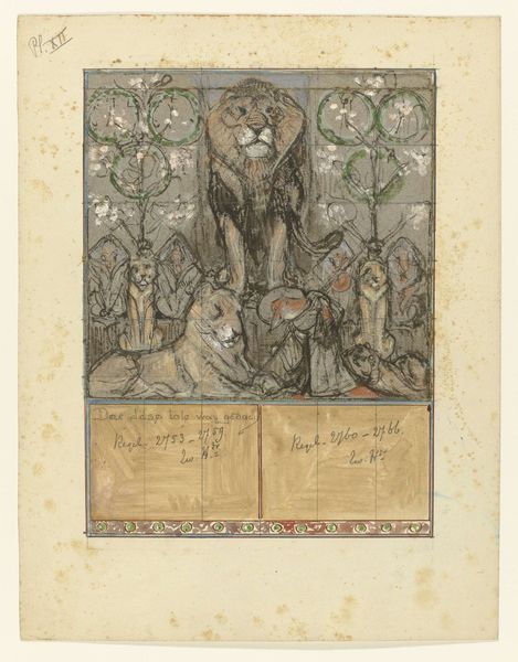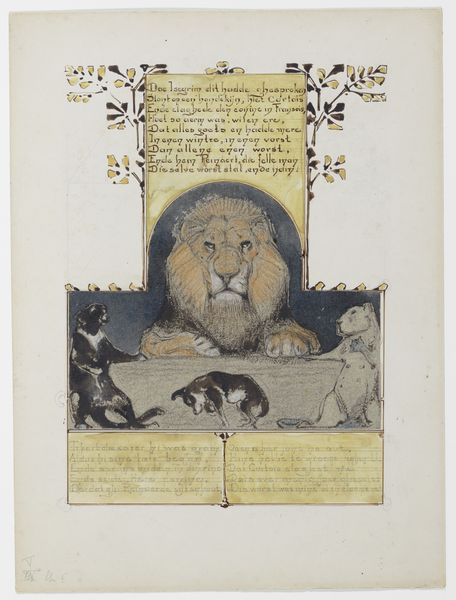 Bernard Willem Wierink created "Firapeel gaat met Bruin en Isegrim naar de koning" using pen and brush in combination with watercolor. The composition presents three animals in a stylized archway: a bear centered, flanked by a wolf and another feline, all rendered in muted browns and grays against a soft green background. The formal structure of the artwork is striking, with symmetrical floral patterns above and a framed inscription below. Wierink's organization of visual elements challenges traditional representational art. The animals, while somewhat naturalistic, are integrated into a decorative, almost heraldic design. This integration destabilizes the conventional hierarchy between subject and ornamentation, inviting a semiotic reading where each element functions as a sign within a larger cultural code. Notice the geometric precision and use of muted color throughout the artwork. This reveals the artist's awareness of both aesthetic and structural principles. The piece functions aesthetically, as a harmonious arrangement of forms. Simultaneously, it challenges viewers to consider how such formal choices reflect and shape our understanding of narrative and representation.