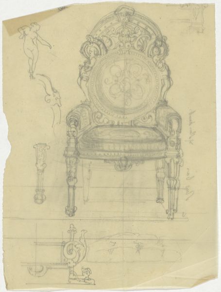 Curator: Look at this—Medaillon, dating roughly from 1830 to 1850, crafted by Firma Feuchère. It's a pencil and ink sketch on toned paper, a design bursting with ornate details. What's your initial take? Editor: Exquisite! It has a fragile beauty. All those fine lines suggesting a grand object—almost like capturing a fleeting thought on paper. Makes me wonder what object was in mind here. Curator: Indeed. There is such detail despite its sketch-like quality. Feuchère was a notable firm producing ornamental designs, catering to the tastes of a society enamored with opulence. These designs, although on paper, informed objects designed for elite consumption and cultural performance. Editor: Absolutely! I notice those cherubs perched atop and the little romantic vignette in the medallion's centre, and a crown right above it all—it gives a sense of playful power and light-hearted sophistication. I’d imagine it on a jewelry box, or as part of furniture. Something for a very fancy lady, perhaps? Curator: It's possible! Think about how these images functioned. This firm circulated designs like this, feeding a market for luxury goods that reinforced social hierarchies and, frankly, gendered expectations. The image itself participates in that theatre. Editor: That is really insightful. It does beg the question, though: Did they understand they were reinforcing or reflecting? Because when I look, I also imagine someone playfully just doodling the most complex and impractical design they could conjure, pushing against rules and boundaries. It has a touch of rebellion there! Curator: Perhaps both! Cultural productions rarely offer one simple answer, right? The market pushes towards replication, but also rewards the allure of a certain creativity or invention. Editor: Well, looking at the little stains, the uneven edges of the paper... it definitely speaks of creative chaos, or at least of experimentation. It shows it was a thought caught on the run, not a careful design for mass-manufacture. A one-off moment that history now allows us to appreciate. Curator: Precisely! A fleeting, beautiful thought preserved. It helps us consider the conditions from which objects are borne and to what end! Editor: Absolutely. A beautiful glimpse behind the curtain.