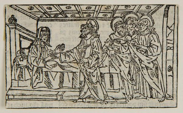 Curator: This stark, anonymous woodcut, housed at the Harvard Art Museums, depicts "Christ Healing a Deaf Mute." The composition feels direct, almost urgent. Editor: Indeed. The stark black lines create a sense of immediacy. The moment of healing is framed by onlookers, but Christ's touch is undeniably the focal point. It's about the human encounter. Curator: The image's power lies in its direct visual language. The artist uses specific gestures – Christ's fingers at the man's mouth and ears, the suppliant's kneeling posture – to convey a profound moment of transformation. Consider how the halo, an ancient symbol of divinity, reinforces Christ's role. Editor: And consider the societal implications! Disability was often perceived as a divine punishment. By depicting this healing, the image challenges those norms, promoting inclusion and highlighting Christ's compassion for marginalized members of society. It’s a powerful socio-political statement, really. Curator: Precisely, it is a reflection of cultural values made visual, a story told through symbolic action that still resonates today. Editor: It gives us a lot to ponder regarding the politics of the period, doesn't it?