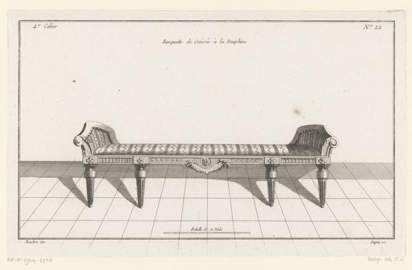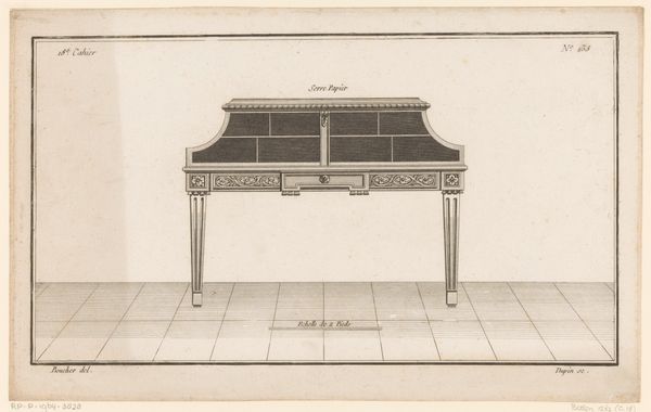 Curator: Looking at this drawing, I immediately feel a sense of ordered calm, like stepping into a very well-organized, slightly austere room. Editor: Yes, that resonates! This is a drawing titled "Commode met drie lades," which translates to "Chest of drawers with three drawers." It’s attributed to Nicolas Dupin, and was created sometime between 1772 and 1779. The artwork resides here at the Rijksmuseum. Curator: Ah, Dupin, of course. It feels very…architectural. It's all lines and careful planning, not a lot of flourish. Though those little pulls on the drawers do have a certain charm. The symmetry, those precisely placed legs. Very…grounded. Editor: Absolutely, you’re picking up on the Neoclassical elements, which emphasizes clarity, order, and a revival of classical forms. Notice the linear perspective, the geometric forms, and the subtle shading achieved with pen and ink on paper. Dupin really prioritized the formal aspects here. I read the stripes on the drawers as repeated parallel lines that create visual rhythm while underscoring a design intended for mass production. Curator: It’s almost like he’s trying to design away any hint of human messiness, you know? This isn't just about furniture; it's about creating a philosophy, an ethos of perfect living space, the idea that order equals happiness! Editor: Exactly! It is also fascinating how academic art traditions intertwine with a practical focus on design in decorative arts. This piece invites us to consider what kind of home this "commode a la Romaine", as indicated on the drawing, would inhabit. Curator: A very pristine one, I'd imagine. Imagine having that in your bedroom—everything would have to match! Although, perhaps the real charm of it lies in the fact that it's just a plan. Maybe it embodies possibility more than any sort of real-world practicality. Editor: Perhaps that's the beautiful tension—between idealized design and its translation into functional objects. Thank you for unpacking those ideas! Curator: My pleasure! Now I can't help but imagine where this drawing came from or the person who dreamt of designing such perfect drawers!