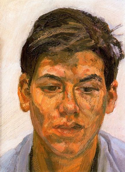 Curator: Alright, so let's consider Lucian Freud's "A Young Painter" from 1958, rendered in oil paint. What strikes you most when you look at it? Editor: I notice this raw intensity, especially in the face. The gaze is unsettling and it almost feels confrontational. How do you interpret this work? Curator: I see Freud, through his unflinching gaze, challenging societal expectations of portraiture at the time. He disrupts the glorification of the individual. Instead, he exposes a kind of vulnerability, even rawness, which deviates sharply from traditional, flattering depictions. The painting embodies a period marked by social anxieties and shifting identities. Do you feel this subverts conventions? Editor: Definitely! I think it's interesting to place Freud's portraiture within that broader context. I never really thought of portraits that way before. The textures feel very visceral, it really makes me feel the painting rather than just see it. Curator: Precisely. Consider how Freud used stark realism to portray subjects with all their perceived flaws visible. How does the piece comment on contemporary notions of beauty and power dynamics within art and society, especially the male gaze? Editor: It almost feels like a counter-gaze! The painting reveals everything, like peeling back layers of social construction. Curator: Precisely. And in its time, this represented a powerful statement. His paintings make tangible the internal struggles within all of us. Editor: Seeing how Freud’s work speaks to these bigger issues—the gaze, vulnerability, the critique of beauty standards—opens up new pathways to think about other artworks, too. I see how art can really engage with those sociological and philosophical themes. Curator: I'm glad to have offered that context and for you to expand your perspective in portraiture.