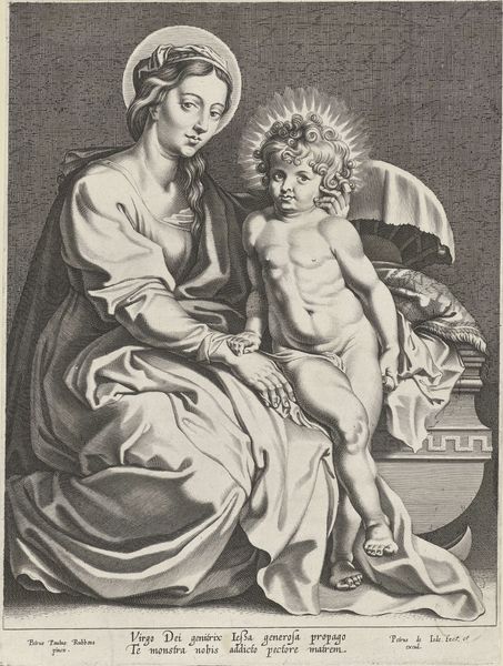 Editor: This engraving, titled "Maria met het Christuskind," from 1698, is by Arnold van Westerhout after a design by Carlo Maratti. The fine lines and details make it feel almost like a photograph despite its age. I'm curious, what jumps out at you when you look at it? Curator: What immediately strikes me is the way it participates in the visual culture and religious politics of the late 17th century. This image served a distinct purpose beyond simple religious devotion, it promotes Pope Innocent XII with a laudatory inscription while also celebrating the fame of painter Carlo Maratti. Editor: So it's both a devotional image and a piece of political promotion? Curator: Precisely! Consider where prints like this would have circulated. They functioned as visual endorsements, shaping public perception of both the papacy and artistic talent. How does the visual style, particularly the embrace of Baroque aesthetics, contribute to these aims? Editor: I guess the drama and idealized beauty lend authority to the figures and, by extension, to the Pope the image celebrates. It’s interesting how those dynamics intersect. I hadn't really considered prints in that way before, beyond their obvious religious purpose. Curator: It is those overlooked elements that often provide the most insightful understandings of an image's historical role. We understand the ways this Baroque period was being presented through the Roman Catholic lens. Editor: It makes you wonder about other prints from the era and the hidden messages they might carry! Curator: Indeed. There is more to learn.