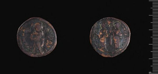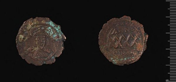 Curator: Up next, we have a copper coin created during the Umayyad dynasty under Abd-al-Malik. Though it's referred to as the Coin of Herakleios, these coins were modeled after Byzantine currency during a period of enormous cultural and political transition. Editor: What strikes me is the density of the markings against the raw, almost crude shape of the coin itself. The visible wear creates a surprisingly appealing texture. Curator: It's fascinating how these coins, initially mimicking Byzantine prototypes, were gradually Arabized, reflecting the evolving identity of the Umayyad Caliphate. Editor: Absolutely. You can see the abstraction of the figural imagery, moving towards a more geometric, symbolic visual language. Almost like a deliberate act of erasure or re-interpretation. Curator: Indeed. It underscores the shifting power dynamics and the deliberate effort to establish a new cultural and political order through currency. Editor: A small object, but it carries so much weight, doesn't it? Curator: Exactly—a testament to how even the most quotidian objects can reveal profound historical narratives.