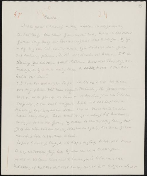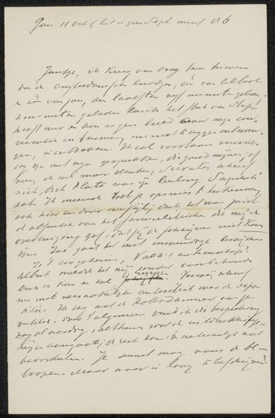 Curator: Pieter Dupont's "Handschrift aan Jan Veth," created between 1880 and 1911, presents us with a page densely filled with ink on paper, a drawing comprised entirely of text. What springs to mind when you first look at this? Editor: Overwhelmed, honestly. It's beautiful calligraphy, obviously, but the sheer density—it's less an open invitation to read, more like an impenetrable wall of labor, each letter a testament to hours spent writing. Curator: Indeed. Consider Dupont's painstaking process, the social context of correspondence in that era. Each stroke reveals dedication. There's an undeniable connection here to both the functional and aesthetic qualities inherent to crafted documents. Editor: Exactly. Was the act of writing itself, the materiality of ink on paper, viewed differently then? I mean, today we type, we text—speed and efficiency are king. The *slow* labour implied here is almost rebellious. Curator: Perhaps. Yet this was a practical means of communication above all else. As a record between two established artists, Jan Veth and Pieter Dupont, it becomes simultaneously a historical document and a personal dialogue. Editor: So, even as a private communication, its meticulousness elevates it. The weight of Dupont's work belies the quick, often throwaway nature we now assign to textual communications. There's inherent value in the time taken, in the quality of materials, regardless of what's actually being communicated. Curator: The artistry resides within that carefulness. It highlights both artistic dedication and the beauty that resides within what would otherwise be merely functional handwriting. Editor: Seeing it as something more than ‘just a letter’ challenges the accepted hierarchies in art, it implies worth to the creation of labour; to a common, shared materiality. This close attention transforms simple ink and paper into a cultural artifact with an artistic language all its own.