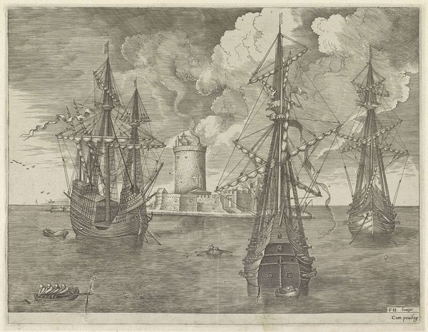 In 1653 the English ship the Samson went up in flames off the coast of Italy after an encounter with Cornelis Tromp’s warship the Halve Maan. Van de Velde represented both vessels at the centre of this pen painting. Tromp commissioned the picture to honour and glorify himself. The work is still in its original frame with the Tromp family coat of arms.