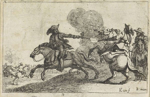 Editor: Here we have Jacques Callot's "Commander on Horseback," an etching. It's a small piece, but so incredibly detailed. What do you make of the commander's assured pose amidst this chaotic scene? Curator: I see echoes of classical equestrian statues, intended to project authority. Yet, Callot subtly subverts this. The horse's theatrical rearing, the commander's almost nonchalant air – it feels less like heroism and more like a performance. It reflects a culture grappling with the glamor and the grim realities of war. What do you think? Editor: It certainly feels like there's more going on than just a straightforward glorification of military power. Curator: Exactly. The symbols are powerful but destabilized, prompting us to consider the psychological weight these images carried and continue to carry. A useful visual reminder.