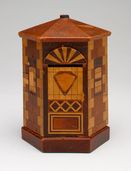 Curator: Well, hello there. What a curious object! It reminds me a little of those tiny houses you see cropping up, only rendered in wood. Editor: Indeed. This is a wooden sculpture of a square building, made sometime in the 20th century. The Minneapolis Institute of Art aptly calls it "Square building with marquetry veneer still bank." It's all about craftsmanship, really, the precise woodworking and the careful construction. Curator: "Still bank," meaning a money box, right? That makes it even more charming. It gives off this beautiful melancholic vibe like a forgotten toy from a bygone era. I picture some old gent, maybe a retired carpenter, whittling this away in his workshop. Editor: Exactly. This combines decorative art with the functionality of a household object. We could dig into questions about class, labor, and access, thinking of the wood as a resource. Who had the time and access to produce this kind of hand-crafted art? Curator: You’re right, it does raise fascinating questions of material access and labor but seeing that little, perfectly square chimney and imagining all the coins rattling inside...It fills me with so many emotions! Editor: Speaking of emotions, this piece probably functioned as both a still bank and decor and raises all sorts of consumer questions. Also, is there meaning in rendering a structure so blocky, so clearly demarcated in individual brick form? Are we to find political metaphors in this choice? Curator: Political? Hmmm, perhaps. It's certainly a solid little thing. But ultimately, it exudes such a sense of nostalgic calm. It's a world within a world, made with love, even perhaps as a meditation on time. Editor: It seems as though the maker hoped to instill particular capitalist sentiments via decorative artwork, yet the veneer of architecture gives it aesthetic appeal to later, perhaps less ideological, observers. It asks that we reflect upon production in all areas of art, too. Curator: Absolutely. What an unassuming yet powerful object! Editor: Precisely. It brings a unique texture and history. Let's move on.