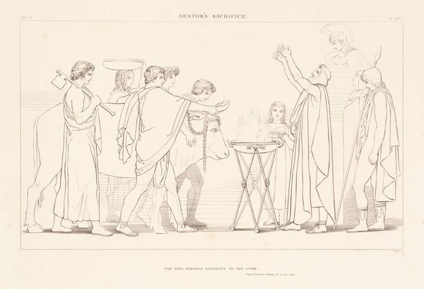 Editor: This is John Flaxman's "Ulysses Following the Car of Nausicaa," held at the Tate. It's a delicate line drawing and I’m struck by the restrained emotion. What do you see in this piece? Curator: Flaxman captures the Homeric tale, and, through line, evokes a sense of classical antiquity. Notice how the figures, reminiscent of friezes, are symbols of virtue and ideal form. Editor: It's interesting that the artist used such minimal strokes to convey this narrative. Curator: Indeed, the sparseness invites contemplation, doesn't it? The horse-drawn chariot also becomes a potent symbol of passage and transition in the image. Editor: Thank you, I never thought of the chariot as such. Curator: The visual language of classicism remains so enduring. Editor: I'll remember that when studying other works of art.