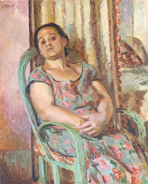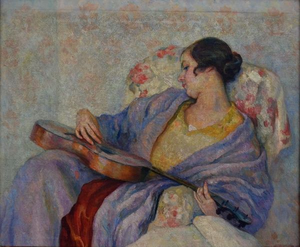 Curator: This is A.R. Middleton Todd's "The Picture Book," from the Tate Collections, rendered in oil on a modestly sized canvas. Editor: It feels intimate, doesn't it? The composition radiates warmth, that ochre chaise lounge wrapping around the sitter. Curator: Absolutely. Notice how Todd employs a limited palette, creating a tonal harmony throughout. The structure relies on the interplay of textures. Editor: And the symbolism! Chrysanthemums, often associated with mourning or remembrance, juxtaposed with the open book… a narrative unfolds. Is she contemplating loss? Curator: Perhaps, but consider the formal arrangement. The diagonal of her body, the repetition of curved forms—it's a study in pictorial balance. Editor: I see the balance, yes, but those flowers, that fleeting moment captured, they evoke a deep sense of the personal, almost a vulnerability. Curator: Well, I’m left admiring the careful arrangement of tonal values, and their effect on the composition. Editor: And I'm left pondering the unspoken stories held within this domestic scene.