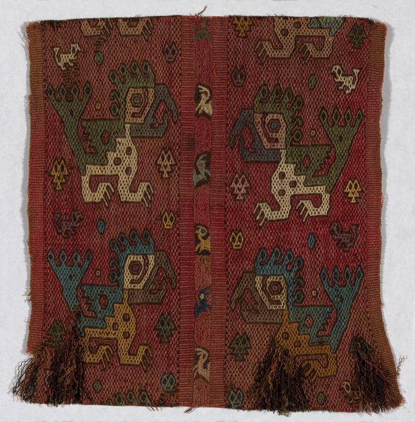 Curator: Here we have "Fragment (Loincloth)," a textile piece likely created between 1250 and 1470 by the Chimú people. The woven fiber work is currently held at The Art Institute of Chicago. Editor: Okay, wow. Immediately, it strikes me as intensely patterned. There's almost a hypnotic quality to the repetition. Curator: Indeed. It's fascinating to consider the role of textiles in Chimú society. Loincloths weren't merely garments; they were powerful indicators of status and identity. We see figuration, of course, and geometric patterns. These weren't arbitrary designs; they conveyed specific social and cultural meanings. Editor: It also makes me think about process, like the hours—days, probably—spent weaving. It's so tangible, isn’t it? This object embodies a community, a cosmology. I wonder about the hands that made this and what those people were thinking. There's a soulfulness in the piece. Curator: Absolutely. Feminist art historians, for instance, might analyze this work by examining gendered labor and craft within the Chimú context, further complicating Western art-historical narratives that traditionally privilege painting and sculpture. It compels us to consider indigenous cosmologies. Editor: Right, disrupting that typical hierarchy! I see this riot of colors. The bold figures give such a wonderful personality. It really invites your attention. I'd love to see this garment moving. Curator: Thinking about the survival of a fragment also speaks volumes about colonization and its impact on textile production in the Americas. The materials, design motifs, and techniques were not static but engaged in continuous dialogue with colonial forces, shaping Indigenous identity through both resistance and negotiation. Editor: Makes me rethink the fragment—incomplete but vibrant. The remaining imagery still holds such weight. Thanks, it really gives you something to chew on. Curator: It encourages us to broaden our perceptions and recognize the significance of fiber arts, moving beyond established parameters of fine art, to weave an interconnectedness between the artifact, its socio-political context, and us.
