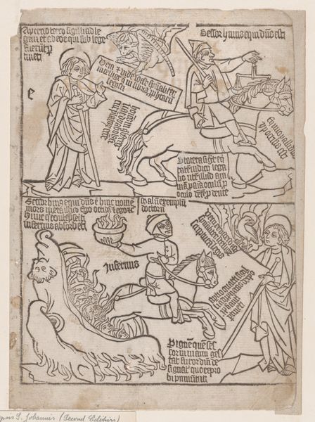 Curator: This arresting print, crafted between 1440 and 1450, is titled "The Angels of the Euphrates Killing Mankind; and The Angel Preventing Saint John from Recording the Words of the Seven Thunders" from an Apocalypse blockbook. Editor: It's certainly... striking. The rawness of the lines and the stark contrast immediately convey a sense of unease and violence. What was the function of blockbooks at this time? Curator: Blockbooks were revolutionary. They served as a popular medium for disseminating religious narratives to a largely illiterate population, democratizing access to these stories through printed images and limited text. This piece likely uses woodcut printing, examining how artisans could efficiently create and circulate visuals, bypassing the need for individually handwritten manuscripts. Editor: Seeing it from a contemporary viewpoint, the depictions of power and subjugation resonate strongly. We see armored figures on horseback trampling figures of men and women on the top section, underscoring social hierarchies and the devastation of war, themes very important to medieval populations due to warfare, poverty, and illness. Curator: Absolutely. And if you consider the materiality—the wood block, the ink, the paper—these elements speak to the period's available technology and resources. They weren’t trying to create hyper-realistic works, rather communicate symbolic and meaningful visual data to audiences. The labor involved would be time consuming but relatively accessible at this point, yes? Editor: True. Looking at Saint John, we see the power dynamics playing out again, but in a more intellectual sphere: the angelic intervention suppresses potentially disruptive knowledge. And the combination of these two registers on a single page heightens the overall impact, offering a multi-layered critique of authority. Curator: I'm drawn back to the artistic craftsmanship required for each print, how a single block wears and degrades through contact, resulting in an unique and ephemeral experience for viewers as each iteration shifts in quality across its run. Editor: Right. Overall, considering the artwork, context, and your perspective on materiality highlights profound ideas regarding power, control, but the simple distribution and construction of media, which gives insight into this very turbulent period of Western history. Thank you for sharing that interpretation. Curator: Thanks to you too. This piece prompts reflection on both its production process and the enduring issues of dominance and suppressed narratives.