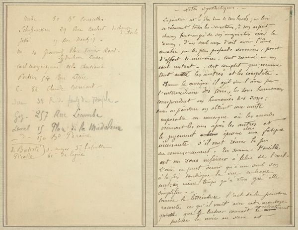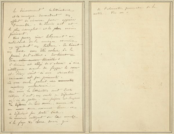 Here we see Paul Gauguin’s "Manuscript Pages," undated, created with pen and ink. At first glance, you’re struck by the density of the writing, divided into two framed sections, evoking a sense of personal musings or theoretical exploration. The texture created by the handwritten script offers a glimpse into the artist's thought process. Gauguin, known for his Post-Impressionist paintings, uses the structure of language here to explore his ideas on art and color. This manuscript reveals Gauguin's structural approach to color theory, breaking down color into quantifiable units akin to musical notes, an idea he further explores with his use of the phrase "coupons entrant". The division of the page into two parts suggests a comparative analysis, a structure that allows him to dissect and examine his concepts methodically. Ultimately, the formal quality of the handwriting itself—its rhythm and flow—mirrors the artistic process, suggesting that the act of writing is akin to painting, both being forms of expression rooted in structure and composition.