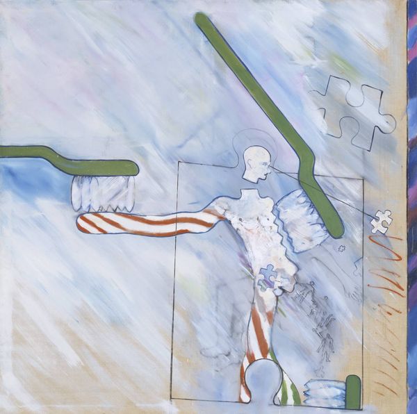Curator: Myles Murphy's "Figure with Yellow Foreground" presents a compelling study in form and color, its dimensions clocking in at 1520 by 2453 millimeters. Editor: The figure seems almost spectral, a fragmented presence emerging from the stark geometric planes. Is she an oracle or a dream? Curator: Considering Murphy’s process, it's fascinating how he constructs the figure using flat planes, almost like architectural drafting. The yellow foreground isn't merely decorative; it's a deliberate disruption of the picture plane. Editor: But that yellow, doesn’t it evoke a sense of caution, a warning about the figure’s ambiguous identity? The obscured face hints at hidden depths or perhaps a denial of self. Curator: The artist's material choices and application are paramount here. Notice how the brushstrokes are visible, revealing the artist's hand in the making. It's not just about representation, it's about the very act of creation. Editor: Precisely! And that act speaks volumes. It's a potent mix of vulnerability and strength. Ultimately, it's a visual riddle, inviting us to project our own stories onto her. Curator: A brilliant observation. It prompts us to consider the constructed nature of identity, as the work becomes a mirror reflecting back our own interpretations.