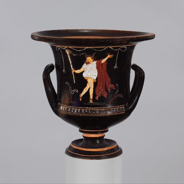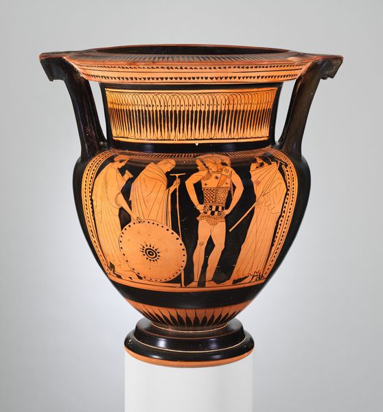 Editor: So, this is a terracotta bell-krater, or mixing bowl, from 350 BC. It’s currently held at the Met. The scene depicted has an elegant feel to it. What do you see in it? Curator: The key for me is in understanding the krater not just as a visual object, but as a product of labor, embedded in a complex social system. The ceramic itself, the processes of its creation – the potting, the firing, the precise application of the slip to achieve the black-figure effect – all speak to a network of artisans. Do you think that labor is visible to us here? Editor: I hadn't considered the labor that went into making the krater itself, focusing more on the narrative scene. The act of creating something so precise out of clay definitely adds another dimension. Curator: Precisely. We also need to consider the "what" of the pottery. A mixing bowl suggests feasting, communal rituals, even trade networks to acquire the ingredients for these events. That gives context to its use that helps interpret the scene. Editor: So, it wasn’t just about aesthetics. It was very functional with socio-cultural relevance. Curator: Absolutely. Furthermore, think of the materials. The clay, where it was sourced, how the pigments were created, how the pot was fired; each step holds information about resources, trade, and technical knowledge. Even its current location in the Met shifts the meaning, elevating it from functional object to art object. How has it gone from daily use object to historical treasure? Editor: That's such a powerful perspective shift. Thinking about all the processes involved makes me appreciate the piece in a completely new way. Thank you. Curator: And understanding how materials, labor and class define that function for contemporary interpretations. Thanks to you for reminding us of how potent even ancient functional objects like this one are.