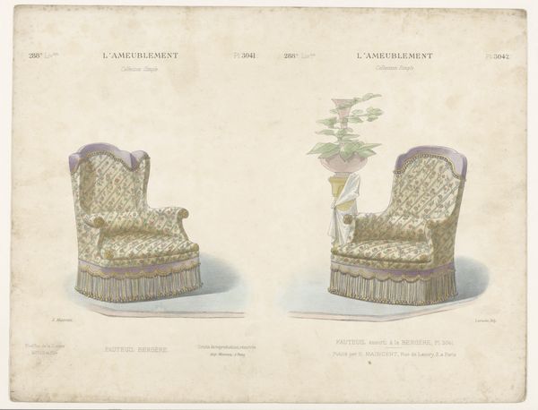 Curator: Ah, yes, this print: *Fauteuil en stoel*, or "Armchair and Chair," made sometime between 1885 and 1895 by Léon Laroche. An exquisite rendering of furniture! Editor: It’s such a delicate drawing! It feels very precise and… almost clinical in how it presents these two chairs. What can you tell me about why something like this would be made? Curator: Well, consider the period and the title of the series, “Le Garde-Meuble”. These prints weren't meant to be artworks hanging on a wall, but more like illustrations for a catalog. Think of it as a very fancy IKEA furniture catalogue from the late 19th century! This drawing represents neoclassicism combined with decorative art. What does that tell you about who would consume this? Editor: That’s fascinating. So, this was less about artistic expression and more about…design and commerce? That changes how I see it completely! I guess the “academic art” style reinforces that. It’s showcasing an ideal form, almost like a blueprint. How were images like this distributed and viewed at the time? Curator: Exactly! The social context is key. This was likely circulated amongst wealthy clientele or furniture makers looking to reproduce these designs. Museums also played a role, archiving and displaying these for study. Do you think the detailed rendering of the chairs reflected how they wished to convey themselves at the time? Editor: Definitely. Knowing it's essentially marketing material really puts the emphasis on craftsmanship and luxury, doesn’t it? It’s not just a chair; it's a symbol of status and refined taste. I had thought these images were works of art hanging on someone's wall. How wrong I was! Curator: It’s all about considering the historical and social context, isn’t it? The politics of imagery shaped then is certainly something worth reflecting on now. It definitely gives us insight into how tastes were formed and maintained in 19th-century French society. Editor: Absolutely! It makes me wonder about the hidden power dynamics behind something as seemingly simple as a furniture catalog. I'll certainly think twice before dismissing anything as "just" a design print from now on!