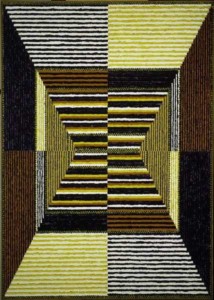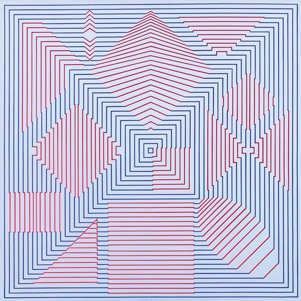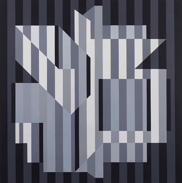 Curator: So precise. It feels almost engineered, but then there's that flicker of off-kilter rhythm that really gets under your skin. Editor: I see exactly what you mean! "O.V.N.I." by Omar Rayo from 1967. It’s executed in acrylic paint, which feels so key to the crispness of those lines. It's the layering of labor, really, meticulous preparation leading to this illusion. Curator: Illusion is exactly the word! The more I look at it, the more I feel a slight sense of disorientation, almost a kind of blissful vertigo. You know, that slightly spacey sensation when a familiar perspective suddenly shifts. Editor: It's the geometry playing tricks, right? He uses a stark monochrome palette punctuated only by a striking blue square. It's a simple element, really, but somehow charges the whole piece with, well, visual electricity! I wonder about his process. Did he pre-plan this rigorously or let the medium guide him? Curator: Rayo had this way of bending space and time with his intaglio techniques—creating such stark geometry while making it breathe. The lines are perfectly clean, yes, but then it pulls you into something much more ethereal. I imagine he saw these clean, architectural lines dancing, evolving beyond the medium. Editor: Absolutely. It really challenges the boundary between Op Art and pure geometric abstraction. I’m also thinking about the ‘60s when this piece was created. How do the rigid structures interact with the social anxieties of the time? Curator: I suppose, beyond a feeling of pure optic intrigue, the artist evokes a sense of quiet observation. Or perhaps he just allows us a quiet, hypnotic space for the viewer to find their own sense of calm, of controlled chaos, within it. Editor: Absolutely! In the end, this piece prompts some thoughts around the boundaries between craftsmanship and calculated effects; I guess they blend to create what is called "art".