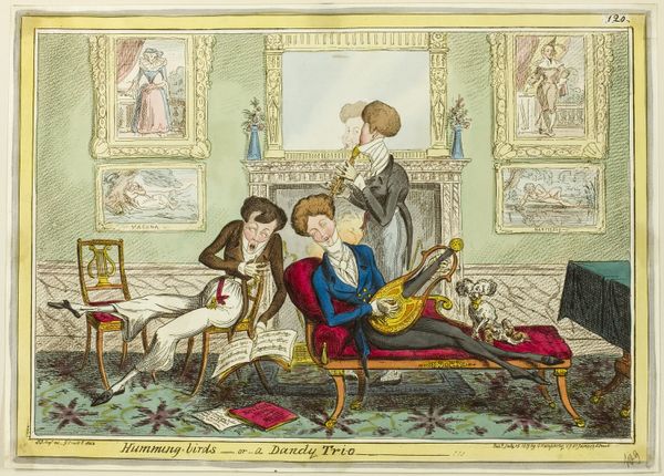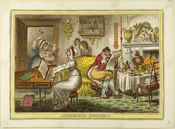Editor: Here we have "Matrimonial Harmonics," an etching by James Gillray from around 1805, currently at the Art Institute of Chicago. The scene feels chaotic and kind of…bitter? There’s so much happening. What do you see in this piece? Curator: Indeed! It's brimming with symbols, all clashing against each other. Note the 'harmonics' of the title. What *is* harmonious about this scene? Consider the symbols of domesticity – the music, the tea service, the family itself – each element seems to be at war. Do you sense how the "music" is received by others? Editor: Not very well! The maid is about to hit the piano with a mallet, and the baby's crying, so no one appreciates music as a refinement or pleasant relaxation in this house, more of a marital torture! Curator: Precisely. The image employs domestic chaos to reveal deeper societal anxieties about marriage, doesn’t it? Marriage here isn't about love but societal pressure, as shown by the cold couple and their interior: cluttered and unsettling, and what do we call an instrument to record atmospheric temperature in order to describe what that symbol conveys within this context? Editor: You mean the thermometer on the wall! Even that shows the tension, since it points to "hot," adding to the picture's theme of emotional unrest. I thought the piece was funny at first, but now I see how critical Gillray is being. Curator: And consider how Gillray is engaging with older traditions of comic art here; for centuries, marital discord has served as both humor and social critique. How does viewing this drawing connect us to those past conversations about marriage, about social roles? Editor: I now get that the drawing goes beyond making us laugh, but helps us reflect on the ever changing dynamic between two souls vowing to be together till death do them part and that requires sacrifice! Thanks so much.