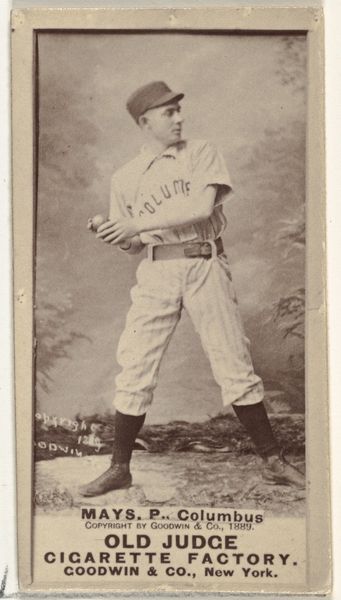 Curator: This photomechanical print, dating to 1887, features Jack McGeachey of the Indianapolis baseball team. Part of the "Old Judge" series, it was produced by Goodwin & Company as an advertisement insert for Old Judge Cigarettes. Editor: It's like stepping into a sepia-toned memory. The man, the baseball bat, the slight smirk – there's an earnestness about him that really pulls you in. Curator: Indeed. The monochromatic palette limits our engagement with pure color, forcing attention to the formal elements: the interplay of light and shadow across his uniform, the textural detail rendered through the printing process. Notice the diagonal emphasis created by the baseball bat as it bisects the composition. Editor: You're right. The sepia tone focuses our gaze on him. It reminds me how we construct memories around the images we love, focusing on who we know. In his case, you have to love baseball. His posture is rather graceful despite its formality. Curator: Formally, the rigid pose reinforces notions of turn-of-the-century portraiture while the diagonal of the bat introduces dynamism. His slightly off-center placement adds visual interest preventing a static symmetry. Consider the deliberate placement of "Old Judge Cigarettes" above McGeachey’s head; the commercial purpose infuses the entire work. Editor: To think that he was a marketing tactic for cigarettes, but the overall feeling is so charming and the visual structure of the work holds up as something to enjoy even beyond the advertisement it supported. Curator: The confluence of portraiture, advertising, and sporting culture gives this piece an intriguing, complex resonance, marking it beyond mere commodity. Editor: It feels like a little portal to a different time, all captured in one, simple promotional shot. Thanks for framing it for me!