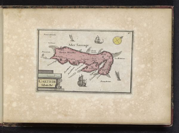 Curator: Immediately striking is the balance between its geometric precision and decorative flourishes. Editor: This is "Kaart van l'Île de Ré," a map created in 1638. It’s rendered in ink and engraving on paper. It provides us with an aerial perspective of the island and the surrounding waters. Curator: The use of line is fascinating. Look at the contrast between the delicate lines defining the coastline and the bolder lines used for the title cartouche. I see ships and wind roses as integral parts of the composition. How were these materials sourced? How was the labour divided in the production of such a map? Editor: These maps were not just aesthetic objects. This was commissioned and consumed in relation to military conflict on the island, informing strategies for naval blockades and troop movements. The materials were available through mercantile routes controlled by powerful state actors. Consider the role of these artisans as skilled labourers contributing to that history. Curator: Let's not reduce this map to just a record of war and colonial resource allocation. I am drawn to how space is represented, the way the island is rendered with surprising detail, creating a sense of depth and distance through precise drafting and subtle shading. Editor: But that very rendering served to impose a certain worldview, a mode of control over a territory and its inhabitants. Think about the labour of the sailors, the cartographers, and the engravers. Each stage of production reflects power relations and colonial ambitions. Curator: Yes, but that geometric rendering is also aesthetically compelling! How else does it fit into a Baroque visual lexicon? Editor: True, and those aesthetics served the purpose of communicating specific geographic knowledge for strategic ends, embedded as they are in the systems of resource extraction, colonization, and military action. Curator: This map, with its visual tension, asks us to confront history and appreciate craft. Editor: A sobering testament to the interplay of art, power, and production, revealing a world where even beauty served political purposes.