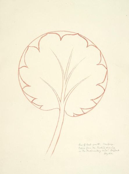 Curator: What a delicate drawing! Charles Herbert's "Flower Design, after Ruskin" offers a meticulous study of botanical form. Editor: There's a certain fragility to the lines, isn't there? The red chalk against the pale paper creates an almost ephemeral quality. Curator: Ruskin's emphasis on accurate observation certainly influenced Herbert. This piece reflects the Victorian interest in natural history. Editor: The composition, though, is intriguing. The fragmented views, the almost diagrammatic presentation... it removes the flower from its natural setting, presenting it as pure form. Curator: I see it more as a reflection of the scientific spirit of the age, categorizing and understanding the natural world. Ruskin believed art could reveal moral truths through careful observation of nature. Editor: Perhaps. But I'm also drawn to the emptiness surrounding the flower. It highlights the artifice of the representation, even while striving for accuracy. Curator: True. It speaks to the complex relationship between art, science, and society in the 19th century. Editor: In essence, it’s a reminder that even the most seemingly objective representations are shaped by the artist's hand and perspective.