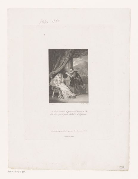Curator: Here we have Emmanuel Jean de Ghendt's engraving, "Méricerte bezocht door haar jonge aanbidder Myrtil," made between 1811 and 1813. It’s currently held in the Rijksmuseum collection. Editor: My initial reaction is that it feels like a tableau vivant, almost staged. The stark contrast between light and shadow really highlights the dramatic interaction. Curator: De Ghendt, as an engraver, was fundamentally a manufacturer of images, often based on designs of others. It is interesting how this print, a multiple, reflects a desire for mass dissemination of idealized classical scenes. Look at the details in the line work, creating texture. Editor: Absolutely. The sharp lines really give the figures definition and an almost statuesque quality that aligns with the neoclassicism apparent here, despite some hints of Romanticism. It makes me wonder how the availability of such prints affected perceptions of power and representation during the 19th century. This image also echoes patriarchal themes about young male lovers at the service of a woman, as shown in mythology or, less charitably, a transaction. Curator: The labor involved in creating an engraving is considerable. It is not just the design but the execution, cutting into the metal, creating something meant to be reproducible and circulated widely to different audiences. This artwork sits at the nexus of craft, industry, and visual culture of that era. Editor: Exactly, and the circulation is key. Prints like these brought narratives from antiquity into contemporary social and political debates. Whose stories were being told and how, speaks volumes about social mores of that period. Curator: Looking closely at the materiality and mode of production contextualizes these mythological themes within an era where visual information circulated through these kinds of printed images. It raises questions of who has access to such stories, and in turn who gets to interpret them. Editor: Well, considering its historical context, I would argue this print offered a visual framework for power relationships, framing desire through idealized classicism. Food for thought about representations we still contend with. Curator: It's precisely this intersection of material making, and accessible narratives that reveals so much about art and culture in the 19th century. Editor: Agreed; through that lens, we can ask better questions about historical consumption and interpretations.