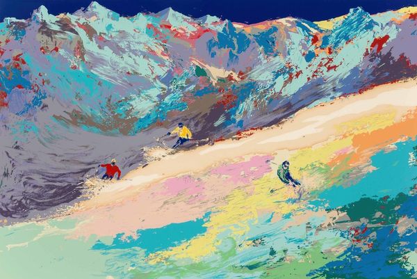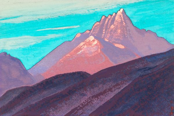 Editor: This is Nicholas Roerich's "Warrior of Light" from 1933, an oil painting depicting a mountain range under a vibrant sky. The colors are so dreamlike, almost otherworldly, and I can’t help but feel a sense of hopeful tranquility. What do you see in this piece? Curator: I see a powerful invocation of cultural memory and symbolic representation. Roerich uses the mountain—a recurring motif in his work—to evoke a sense of the sacred, the eternal, and the aspiration for spiritual heights. Consider how mountains function as meeting places between the earthly and the divine in many cultures. Editor: That’s interesting! So, you see the mountains here not just as geographic features but also as symbols? Curator: Precisely. The “Warrior of Light,” if we understand that figure as inherent in each of us, suggests a journey towards enlightenment, reflected in the climb towards the mountain’s peak. The ethereal clouds hint at transformation, while the contrasted dark slopes evoke what? What feelings rise within you when viewing these colors and forms? Editor: I think I understand! I was drawn to the lighter, brighter portions first. The slopes, I guess, evoke challenge and perhaps the unknown that the warrior must traverse in his ascent toward enlightenment. The shapes are less definite too, creating contrast to the lightness above, like day and night or knowledge versus mystery. Curator: Indeed, consider then how Roerich intertwines Romanticism's reverence for nature with Symbolism's language, forming potent visual expressions of theosophical ideals. Seeing it this way, does the painting’s message of striving for light resonate more deeply? Editor: It really does! I initially just saw a pretty landscape, but now I realize how much deeper the meaning goes through these embedded cultural symbols. Thank you!