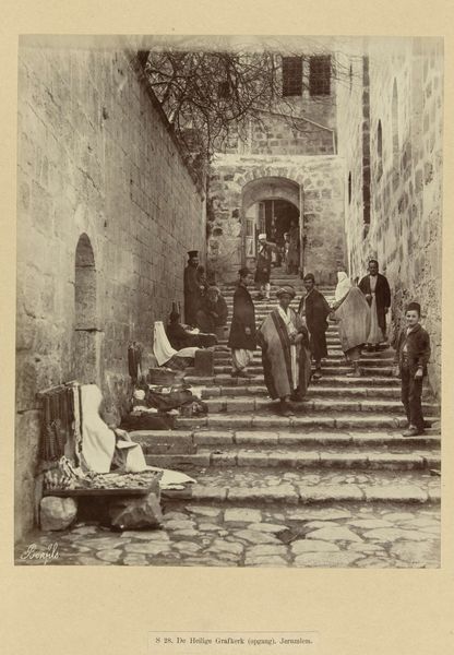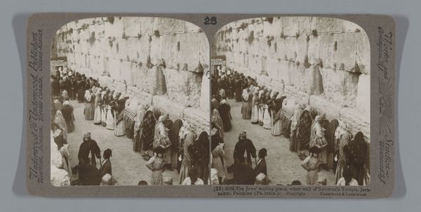 Editor: This is "Praying Worshippers at the Wailing Wall in Jerusalem" by Maison Bonfils, a gelatin-silver print dating from somewhere between 1867 and 1895. The somber tones and the close proximity of the figures really give it a sense of solemnity. How do you interpret this photograph? Curator: What strikes me is how this image, likely intended for a European audience, participates in the visual construction of the "Orient." The focus isn't just on documenting a religious practice; it's also about creating an image of a distant and exotic land for consumption. Consider the name, too. "The Wailing Wall" and the casual association in the lower left; it implies a lament that arguably catered to Western stereotypes. Editor: So, the framing of the subject, especially the implied narrative through the Western title, could potentially overshadow the authentic experience of the worshippers? Curator: Exactly. Photography in the 19th century often served colonial interests, reinforcing power dynamics. Bonfils, a Western photographer operating in the Middle East, held a certain position of authority in choosing what to show and how to show it. Think about who had access to the image, and what messages were subtly (or not so subtly) being conveyed. What details strike you within the photograph? Editor: I’m now seeing the image differently. It makes you consider the gaze of the photographer, and the power dynamics inherent in capturing this scene. It's about more than just prayer, it’s a cultural artifact laden with history. Curator: Precisely. Recognizing that layers of context transforms our understanding of the image, beyond just what’s represented on the surface.