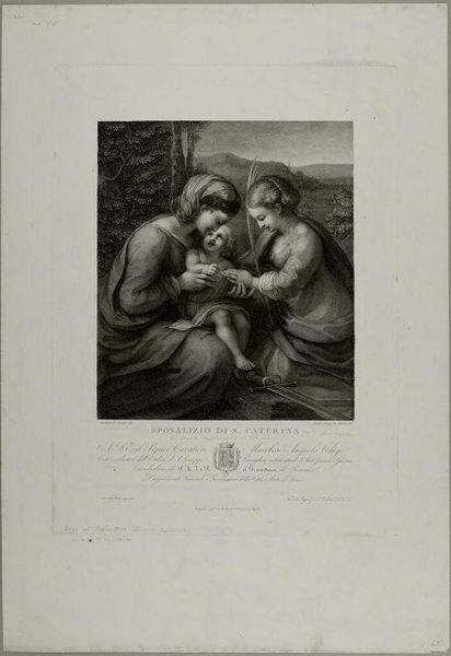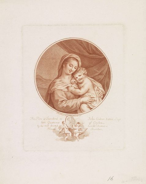 Editor: This is Auguste Gaspard Louis Boucher Desnoyers' "The Virgin of the Chair," housed at Harvard Art Museums. What strikes me is the circular composition, it feels very self-contained. What do you see in the structural arrangement? Curator: Indeed. The tondo format, typical of the Renaissance, invites a focus on the figures themselves, specifically the interlocking forms of the Virgin, Christ Child, and John the Baptist. Notice how Desnoyers employs chiaroscuro to model the figures. Editor: So, it's about the relationship between light and form creating a sense of depth and volume? Curator: Precisely. The artist uses light to define form. This technique, coupled with the circular design, draws us into the intimate space. Editor: I see it now. Thanks for drawing my attention to those elements! Curator: My pleasure, appreciating the construction of an artwork allows for a greater understanding.