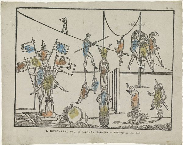 M. Hemeleers-van Houter made this print, probably sometime in the mid-19th century, using etching, with some hand coloring. It depicts a printing workshop, filled with figures busy at various tasks related to the printing process. This work offers a glimpse into the world of early printing, a technology that had a profound impact on society. Looking at the print's cultural references, its historical associations and visual codes, it is difficult to determine the country where it was made, though the text is in Dutch. We might consider how the rise of printing contributed to the spread of knowledge, the growth of literacy, and the development of public opinion. The image also opens up avenues to explore the institutional histories of printing, including the roles of publishers, printers, and readers. By studying prints like these, historians can gain insights into the social conditions that shaped artistic production and the complex relationships between art, technology, and society.
