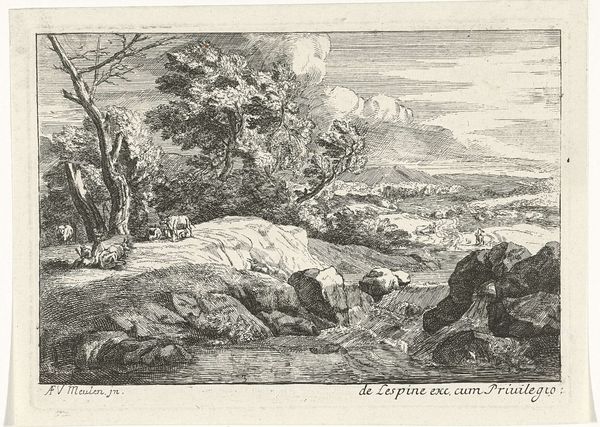 Editor: Here we have "Gezicht op een landschap met herders," or "View of a Landscape with Shepherds," a 1762 etching by Jan Lauwryn Krafft. The textures are amazing in the rendering of the nature elements. How would you read the visual structures here? Curator: Primarily, I see a deliberate contrast achieved through composition. Note the opposition between the architectural ruins and organic landscape features. One, linear and sharp; the other, soft and varied. This juxtaposition defines the image’s structural core. Do you see the directional lines at play? Editor: You mean how the broken column draws your eye upward? And the figures lead your eye towards the middle ground? Curator: Precisely. These elements direct the viewer's gaze, controlling the visual experience. Note, too, the etching technique itself. Observe how different densities of line create tonal variation, simulating light and shadow to give form to the composition. Editor: I see, it’s like a delicate balance of light and dark! The architecture almost serves to frame and intensify the pastoral setting, am I right? Curator: To a certain extent, but remember, everything is a function of the whole. Each part contributes to the formal effect and inherent aesthetic meaning. Editor: So, it is not just a pretty picture, it is a carefully designed image built on layers. That’s more than I realized initially. Curator: Exactly! Understanding how those formal elements interrelate, that is key to deeper engagement.