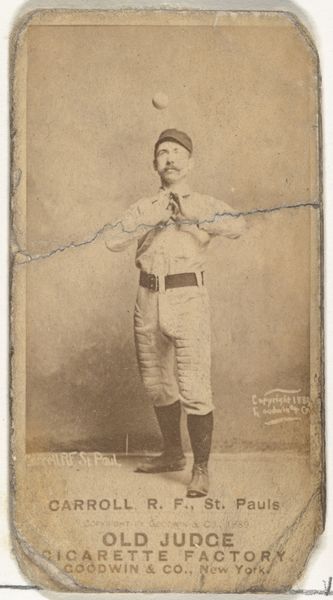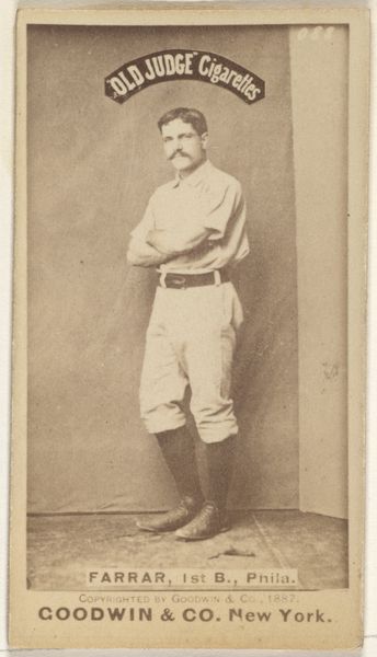 Curator: So, here we have "Buffinton, Pitcher, Philadelphia," a photograph from the series Old Judge Cigarettes, produced by Goodwin & Company in 1887. It's currently housed at the Metropolitan Museum of Art. Editor: My first thought? Nostalgia, plain and simple. Something about that sepia tone, and the earnest, almost hesitant, way he holds that baseball just gets me. Curator: Right. It's fascinating how images like these functioned as early advertisements. Consider the socio-economic context: baseball emerging as a national sport, burgeoning consumer culture, and, of course, the ubiquity of cigarette advertising. Editor: Exactly. He looks almost uncomfortable posing. Like he’d rather be out there on the field. There’s a beautiful kind of tension. That serious face mixed with that…well…those slightly goofy striped stockings. I love it! Curator: He’s presenting a particular brand of masculinity of the era. The image normalizes athleticism but simultaneously aligns it with other forms of consumption—tobacco use being one of the most prevalent and socially accepted. Think about it: these cards were meant to be collected, traded, consumed. Editor: It’s such an interesting intersection of commerce and celebrity. You look at this guy and you think “sports hero!”… but then you see “Old Judge Cigarettes” emblazoned right there, anchoring him back into the everyday, into the product they’re pushing. It almost makes the hero relatable? Curator: The photographic technology also informs how we read this work. These were mass-produced prints and drawings meant to circulate widely. It raises important questions around reproducibility, celebrity culture, and image distribution in the late 19th century. Editor: The simplicity is kind of arresting, too. It isn't staged for some grand spectacle; it just features this guy, caught somewhere between action and a frozen kind of potential. Like right before a pitch, maybe, a breath before the motion. Curator: Agreed. Considering this artwork now, in a world saturated with advertising, forces us to consider the construction of identity and how these types of images contributed to the development of sport as both spectacle and industry. Editor: Well, thinking about where baseball is now compared to back then. There’s something…comforting…almost innocent about this image. No big stadiums or billion-dollar contracts; just this guy, this ball, this moment.