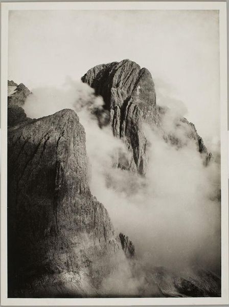Curator: Vittorio Sella's "Pala de St. Martino (au coucher du soleil)" presents a stark mountain landscape shrouded in cloud. What's your immediate take? Editor: It feels so ethereal, like a dream of stone and mist. I am drawn to the texture of the rock and the way the light softens everything. Curator: Sella was renowned for his technical prowess. As a photographer, he documented the material realities of mountainous regions. We should remember that this view was created using laborious darkroom techniques. Editor: Yes, and to think of the effort required to haul the equipment up there! It makes the image feel even more monumental, a testament to human determination. Curator: Indeed. This piece challenges notions of landscape photography, focusing instead on the sheer physical effort required to capture such a view. Editor: I still get lost in the dreamlike quality. It makes me question what is real and what is just imagined. Curator: A fitting end note, perhaps, as Sella reminds us of the power of both process and perspective. Editor: Exactly. It's a dance between reality and our dreams.