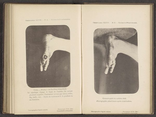 Curator: Here we have a photograph, or rather a gelatin-silver print, of a patient suffering from erythema circinatum and exfoliativum. It dates from before 1881. Editor: It's haunting. The composition with the two hands isolates the textures of the skin. Almost lunar in its greyscale. Curator: What interests me is that this work challenges what we traditionally consider art. This wasn't created for aesthetic pleasure, but as a medical record. Look at the precision and detail captured through the photographic process. Editor: But doesn't that precision elevate it? The focus on capturing the texture of the skin transforms documentation into a tactile experience for the viewer. The light reveals more than just disease, there’s the underlying wear and tear of daily life embedded in each wrinkle. It forces you to think about labor. Curator: Absolutely. The materiality of the print itself becomes significant. A gelatin-silver print would have been chosen for its clarity and stability, a medium prioritizing accurate clinical study and reliable dissemination across the medical community. But what's particularly jarring is how accessible this was meant to be! Imagine the book circulating, these unsettling details passing from hand to hand… Editor: Yet even in its clinical coldness, there’s something inherently human, poetic even, in its rendering. I wonder what the patient felt. Curator: Indeed, that blend of objectivity and intimacy, a certain tension of looking, complicates our viewing experience, which goes beyond objective understanding and touches a more subjective, human sensitivity. Editor: It definitely reveals an intriguing link between the scientific, the artistic, and the deeply human, through a photographic document meant only for utility. Curator: Ultimately, considering the socio-historical context, seeing this almost forensic dedication to both detail and document forces one to reassess photography’s unique relationship with not only material, but mortality.