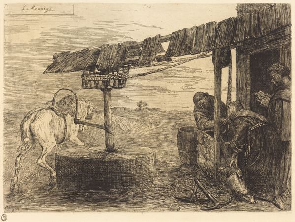 Curator: What a poignant piece. This is "Vagabonds of Montrouge" by Alphonse Legros. We believe it's a print, a sketchbook page perhaps, using pen and pencil on toned paper. Something about it feels unfinished, raw. Editor: Yes, it has that immediate quality. There's such tenderness radiating from this seemingly simple pen sketch; this immediate empathy, too. Do you sense it? The stooped shoulders, the almost imploring stance of the figure in the foreground...they communicate so much weariness and compassion. Curator: Absolutely. Legros was deeply interested in social realism, wasn’t he? Capturing the lives of ordinary, often overlooked people. These figures, these "vagabonds," seem rooted in that same impulse. Their shared burden becomes palpable through the details—their clothes, their expressions, even the way they lean on one another for support. There is some interesting contrast in their costumes as well: what does the figure on the left's headwrap speak to you? And on the right we find what almost looks like the upper-class top hat... Editor: Fascinating juxtaposition indeed! Perhaps speaking to different positions of the figures, maybe along their path away from what might have once been comfortable surroundings... The wheelbarrow in the middle could even symbolize, literally and figuratively, a 'rolling away,' as the inscription partially visible on it is "BON," so a path to what is "good," is to roll away. It is fascinating. But it looks almost as worn as the characters who are trying to cart it! Even something of everyday life that might be looked to for hope is clearly weathered with life's circumstances, isn't it? Curator: Very much so. And the stark landscape amplifies this sense of melancholy and resilience. There is even something faintly religious to this presentation that cannot be ignored. Editor: You're right. This idea of finding the good even amongst dire circumstances carries an unmistakable biblical association of sorts. I suppose that is not exactly the first time such a theme emerges in European artworks... Curator: Exactly. Overall, it makes you wonder about their stories, doesn't it? The hardships endured, the dreams carried, however faint... Editor: Indeed. It invites us to reflect on the human condition, in all its beauty and fragility.