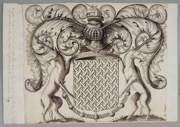 Editor: This anonymous piece, "Coat-of-Arms, with two unicorns", shows an incredible level of detail, and I can't help but wonder about the story it tells. What stands out to you in terms of its historical context or symbolism? Curator: Well, unicorns, often perceived as symbols of purity and grace, were also linked to power and nobility. Consider how this imagery might have functioned within a specific social hierarchy. What kind of statement was being made here? Editor: That's fascinating. So it wasn't just about aesthetics, but also about asserting social standing and potentially excluding others? Curator: Precisely. Coats-of-arms were never neutral; they were carefully constructed narratives about identity and power. The inclusion of the unicorns, along with other symbols, reveals a complex interplay of cultural values and social ambitions.