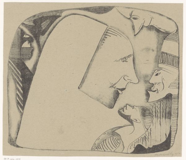 Editor: We're looking at "Death of a Mirror," an etching made in 1946 by Minna Citron. It’s a fascinating jumble of geometric shapes and textures, and I get a sense of fractured reflections from it. What do you see in this piece? Curator: It’s compelling how Citron uses abstraction to address societal shifts post-World War II. Consider the historical context: The mirror, traditionally a symbol of vanity and self-reflection, is “dead.” This could be Citron critiquing a societal obsession with superficiality after such devastation. What sort of audience do you imagine this addressing? Editor: I suppose someone involved in arts and culture in New York at that time, particularly with its burgeoning avant-garde scene, might connect with it. I like how Citron rejects straightforward representation for something more fragmented and critical. Curator: Precisely. The fracturing you mentioned reflects the fragmented psyche of a world grappling with trauma and the dawn of the atomic age. Etching, a printmaking technique allowing for multiplicity, speaks to art's growing role in social commentary and disseminating political thought. What effect does her limited palette have? Editor: The gray scale brings out the details. Maybe this echoes a sense of austerity from wartime. Overall, it seems a conscious move away from color, prioritizing form and texture. Curator: A sharp observation! By focusing on formal elements, she asks us to consider how we rebuild after destruction. How do we move forward? This print exemplifies how art served as a critical tool for cultural analysis and challenged viewers to engage with a changing world. Editor: So, "Death of a Mirror" isn't just about a broken object; it's a reflection on a broken society and how we find meaning within it. I definitely appreciate its social relevance more now. Curator: Indeed. Art allows us to re-evaluate established forms in ways that promote broader conversation.