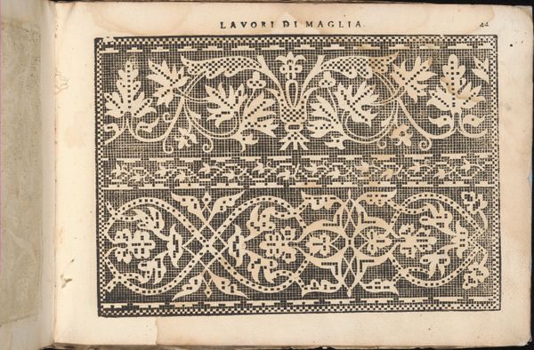 Editor: So, this page is from Isabella Catanea Parasole's "Teatro delle Nobili et Virtuose Donne...," printed in 1616. It's a drawing showcasing patterns for textile work. I am intrigued by how geometric shapes can form intricate patterns. How would you interpret this work? Curator: Look at how Parasole intertwines nature with geometric precision. What appears as decorative surface initially, can become a powerful signifier of status and skill. These patterns are not merely aesthetic choices; they symbolize wealth, refinement, and a connection to a larger cultural heritage of female artistry and intellect. Does it remind you of other forms of Renaissance patterning, perhaps in gardens, or even manuscript illumination? Editor: Yes, I see that connection! There is a controlled sense of symmetry with the stylized floral motifs. Did the imagery carry specific meanings for the women creating these textiles? Curator: Absolutely. Each motif had a weight—floral designs suggested virtues or evoked classical allegories. The act of recreating them was a continuous process of transmitting cultural values across generations. It was more than mere craftsmanship; it was cultural encoding and continuity. Editor: Encoding, yes. So these patterns function almost like a language then, silently communicating complex ideas through seemingly simple shapes. Curator: Precisely. And through continuous engagement, these symbols remain resonant even today. It makes me wonder about the symbols we use today – will future generations recognize their meaning, and more importantly, their cultural importance? Editor: I've never thought about textile design in that light. Thank you, this has really changed how I see these historical patterns!