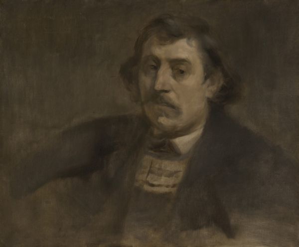 Editor: Here we have William Merritt Chase’s “Portrait of a Man,” painted around 1875 using oil paint. The subject's gaze feels both intense and distant; what strikes you most when you look at it? Curator: Oh, it's the dance of light, isn’t it? See how it caresses the man's face, lingers on the beard, then slips away into the shadows? It feels like a stolen moment, an intimate glimpse. Chase captures not just a likeness, but the very essence of a contemplative soul. Editor: I notice how the brushstrokes are quite visible, almost impasto in places. Does that suggest something about Chase’s intentions, or the artistic climate at the time? Curator: Absolutely! The visible brushstrokes… it’s as if Chase wants us to know that this isn’t a photograph, but an act of creation. This was a period of huge experimentation, when artists were loosening the rigid constraints of academic art. Perhaps he yearned to capture the fleeting moment, the inner truth, more than mere superficial appearances. The portrait feels modern, a statement of painterly freedom! Don't you get that sense? Editor: I see what you mean. There's a tension between realism and something more expressive. I appreciate the immediacy and emotional depth it gives the portrait. Curator: Exactly! It makes me wonder what that man was really like. Editor: It is really powerful how you have encouraged me to delve deeper and perceive not just the artwork's visual details, but its subtle story! Curator: Art is so powerful, and every visit is unique! It speaks to us in different ways as our experiences shift and mold our sensibilities. It makes one want to see more, feel more, experience more.