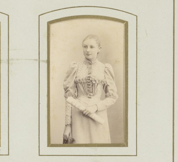 J. Miestadt's "Portret van een staande vrouw in witte japon" captures a woman in a full-length white dress. While the exact date is unknown, this image invites us to consider the cultural and societal context of the time. During this era, photography became a tool for constructing and preserving identity, especially for women navigating societal expectations and gender roles. The woman's attire, a pristine white dress, perhaps signals purity, status, and respectability - values highly esteemed in many Western societies. Yet, the portrait also hints at the subject's individuality. She stands confidently, her gaze direct, challenging traditional representations of women as passive or demure. Photographs like this served as records of existence but also as carefully constructed performances of self. They reflect the complex interplay between personal identity and cultural norms, inviting us to reflect on the power of representation and the untold stories behind each image.