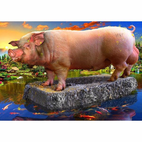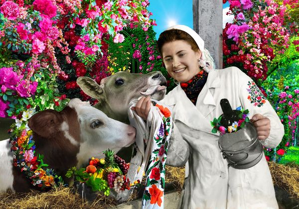 "Rhinoceros tamer" by Babak-Matveev, created in 2014, seems to play with color as a portal to another world. The artist dives headfirst into the process of world-building. Color and light are applied in ways that render depth as a concept rather than a reality. The palette is hyper-saturated and intensely vibrant. Look at the woman's stance, she is self-assured and strong, yet the rhino looks almost docile, even decorated with a floral anklet. This piece is all about contrasts and unexpected harmony. Consider that background! It gives me the same feeling as those backdrops in old photography studios, like something out of a dream. Overall the piece embraces ambiguity, welcoming multiple interpretations. It's an invitation to explore the boundless possibilities of art, where the real and the imagined blur into one. It reminds me of Rousseau, a self taught artist who worked with similar imagery and palette to evoke a sense of the surreal.
