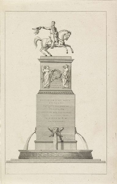Curator: It possesses a solemnity, doesn't it? Stark and undeniably mournful. Editor: Yes, it does. What we're looking at is an engraving titled "Grave Monument for Author Rhijnvis Feith in the Cemetery in Zwolle," created sometime between 1825 and 1855 by Johannes Alexander Rudolf Best. Curator: The symmetry of the monument is striking, classic Neoclassical lines, capped by what looks like a draped urn. A potent symbol of loss, universally understood, marking absence. Editor: Indeed, and positioned in what seems to be a meticulously rendered cemetery. The rows of graves stretching into the background establish a visual context, underscoring Feith's place within the broader community of the departed. It speaks volumes about public mourning in the 19th century. Curator: Notice the bas-relief on the monument's base. It's a scene depicting figures surrounding what might be an altar or a dying figure—a visual invocation of mourning rituals and familial comfort in the face of death. The engraving style is typical of Neoclassical art with austere outlines, emulating ancient Greek and Roman relief carvings to suggest an elevated cultural legacy. Editor: Precisely. And there's that cartouche with intertwined initials. I'd wager that is the Feith family's emblem—a powerful signifier for lineage and societal position. It suggests how death and remembrance are tied up in identity and power. Do you see the chains? Even these add another symbolic and physical layer to the space, marking exclusivity. Curator: It evokes a sense of cultural continuity, too. These visual choices connect the author to historical archetypes of greatness, attempting to keep his memory alive not just personally, but also in relation to cultural tradition. It serves as a constant reminder of virtue, legacy, and a family's role in maintaining that memory. Editor: I think that sums it up nicely. This piece reminds us that mourning rituals are, were and continue to be a reflection of societal values and power structures. Curator: A beautifully rendered artifact, laden with visual meaning, speaking to both individual sorrow and enduring cultural narratives.