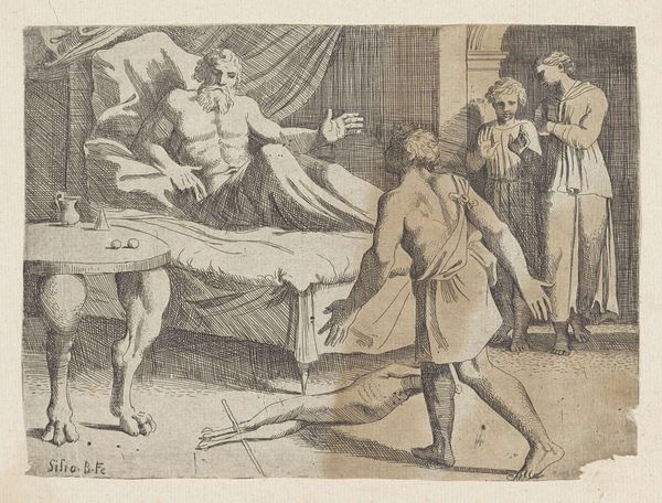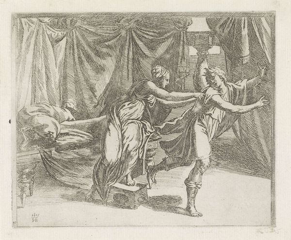 Giovanni Lanfranco created this print, titled "Jozef en de vrouw van Potifar", sometime in the 17th century. It depicts a dramatic moment between Joseph, an enslaved man, and the wife of Potiphar, his master. The story, derived from the Book of Genesis, centers on themes of power, desire, and betrayal. Notice how Lanfranco portrays the woman as the active aggressor, seizing Joseph's garment, while Joseph recoils, seemingly in fear. This depiction plays into historical stereotypes of women as temptresses, figures whose sexuality poses a threat to male virtue and social order. However, this print also subtly acknowledges the power dynamics inherent in their relationship. Joseph's status as an enslaved person complicates any simple reading of seduction. In a society built on inequality, consent becomes a murky concept. Here we are left to consider the intersectional dimensions of gender, class, and forced servitude within this intimate encounter.