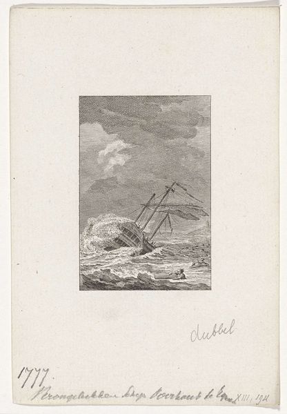 Editor: Here we have Reinier Vinkeles' engraving and etching titled "Schipbreuk van de Overhout, 1777," made sometime between 1780 and 1795. It's a dramatic depiction of a shipwreck! What stands out to me is the incredible detail in the waves and the wrecked ship; the print really conveys the chaos of the event. How do you see this piece? Curator: Well, given my focus on the materiality and social context of art, I see this print as a document reflecting 18th-century Dutch maritime power and its inherent risks. The precise lines of the engraving, the repeatable nature of printmaking itself – these speak to a culture of documentation, of disseminating information about trade, empire, and, indeed, disaster. The shipwreck, we must remember, wasn't just a tragedy; it represented a potential disruption of the flow of commodities and power. Editor: That’s interesting, I hadn’t considered it as part of that larger system. Does the choice of etching and engraving—relatively accessible mediums—play into that accessibility of information for a wider audience? Curator: Precisely! This wasn't an oil painting destined for a wealthy collector. Prints like these were reproduced and distributed, reaching a broader segment of society interested in the activities, successes, and failures of the Dutch East India Company. How do you think that potential audience would interpret such imagery? Editor: I suppose, in some ways it acts as a sort of propaganda then, shaping the narrative around Dutch maritime endeavors – the heroism and danger inherent to them. Curator: Exactly. We see the ship depicted, its remnants. How long did it take to create? Who created it? Where does its cargo go, and what are those routes for raw materials worth to others? It is this material context, that reveals an alternative image in viewing this print, it reflects a visual component in the vast enterprise of material extraction that shaped that world. Editor: This has definitely changed my perspective. I now appreciate it’s not *just* a historical depiction of a shipwreck but also an insight into 18th-century Dutch material culture. Curator: And the complex systems of labor and capital behind even a seemingly simple print. That’s the materialist perspective!