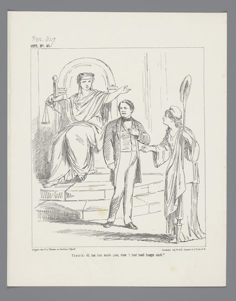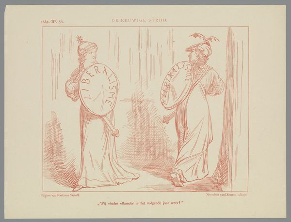 Editor: This engraving from 1877 is called "Spotprent," and the artist is Johan Michael Schmidt Crans. It seems to depict two figures in classical dress, but there's a definite tension in their interaction. What kind of narrative or symbolism do you see embedded in this image? Curator: I am immediately drawn to the figure on the right, adorned with a helmet and shield emblazoned with what seems to be a distorted Union Jack. The iconography speaks volumes. The artist clearly references Britannia, a visual symbol of Great Britain since Roman times. The gesture towards the other figure suggests offering something, perhaps dominance, while her downcast gaze hints at conflicted feelings. Editor: And the figure on the left? She looks like she is turning away? Curator: Exactly. Her averted gaze coupled with what seems to be a farmers hat atop a spear signifies resistance. Consider the political context: this print is titled "Annexation of the Transvaal Republic." The entire composition embodies cultural memory and anxieties around colonial expansion. The broken flag lying between them seems particularly poignant. What does it evoke in you? Editor: Defeat, maybe, or a broken agreement. So, the artist is using these symbolic figures to comment on the political situation, rather than just illustrating it directly? Curator: Precisely. This is a powerful example of how images serve as vessels for conveying complex historical and cultural narratives, laden with symbolism that transcends simple representation. The power dynamics on display can evoke discomfort and reflection, even today. Editor: This gives me a whole new way to understand the cultural weight images carry. I hadn't considered the artist's intent to critique and capture those power dynamics. Curator: Indeed, unlocking these layers transforms how we experience art. Understanding their symbols offers invaluable insight.
